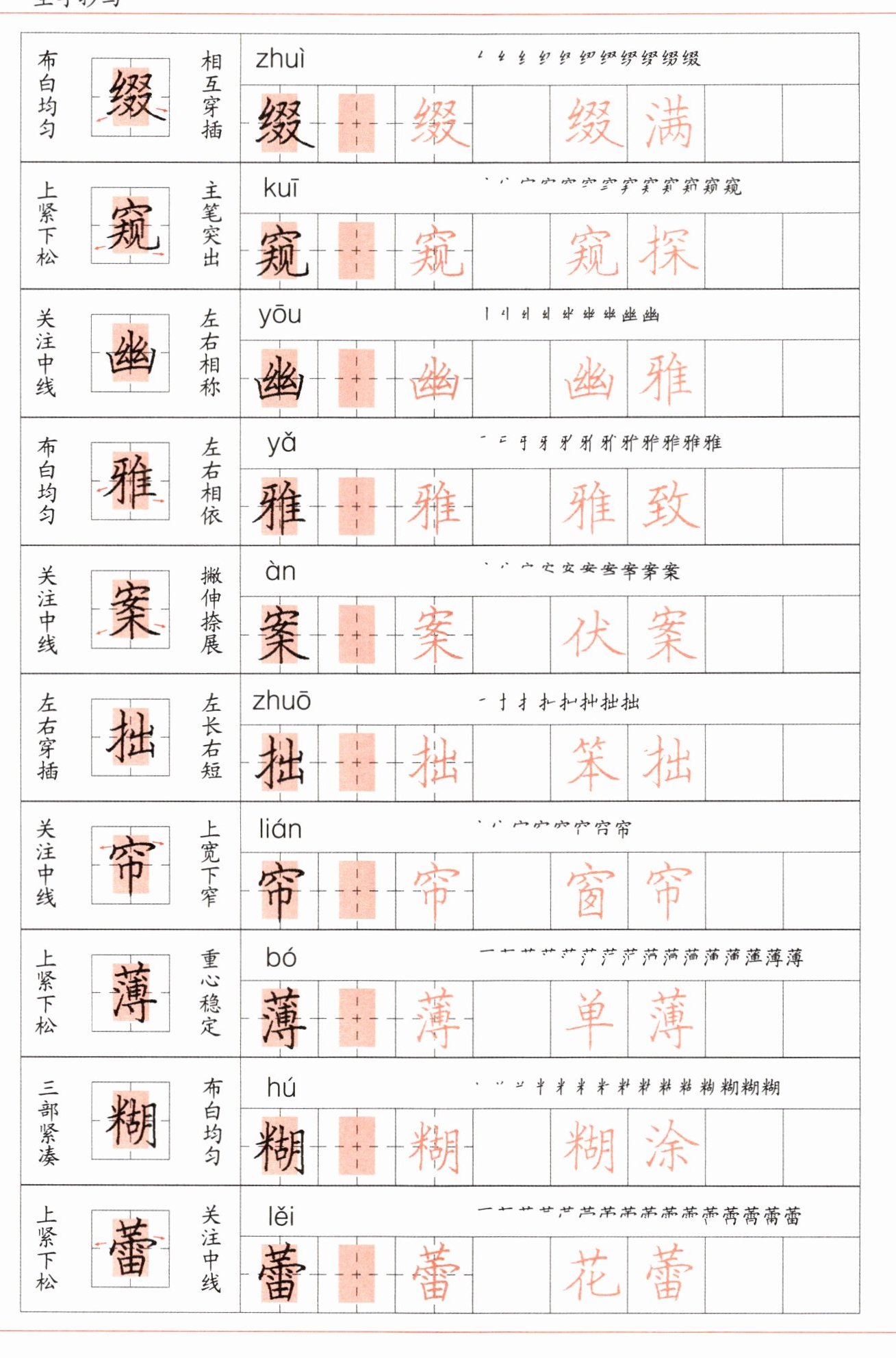 | 结构提示 | 田字格汉字 | 书写要点 | 拼音 | 笔顺 | 汉字书写 | 组词 |