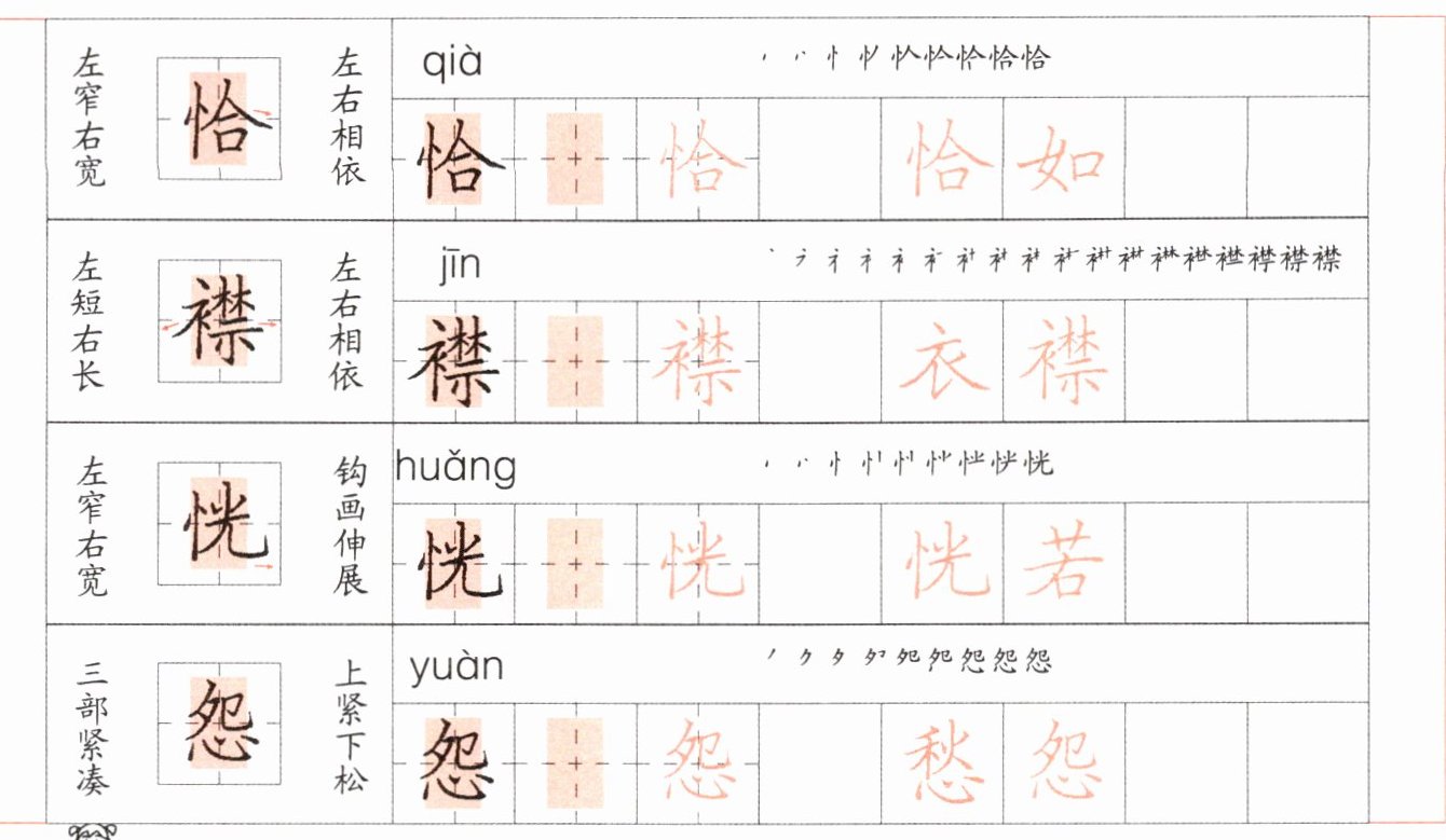 | 左窄右宽 | 恰 | 左右相依 | qià | 忄忄忄恰恰恰恰恰 |