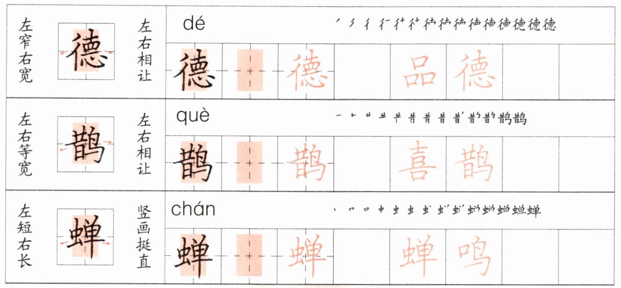 | 左短右长 | | 竖画挺直 | chán | 口 口 虫 虫 蝉 蝉 蝉 | | | | |