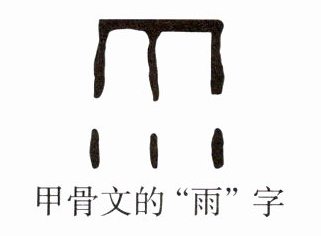 (示例)甲骨文的“雨”字,像天空降落水滴的样子,本义指水从云中落下,六书中属象形。