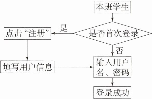 (2)本班学生登录该应用时,需先判断是否首次登录。若是首次登录,点击“注册”,填写用户信息后输入用户名和密码,即可登录成功;若不是首次登录,直接输入用户名和密码,即可登录成功。