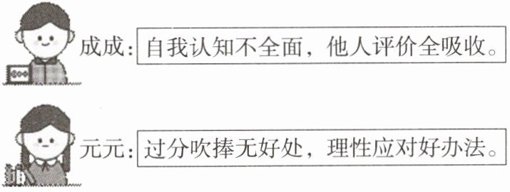 (2)成成的观点错误,元元的观点正确。①他人的评价是我们认识自己的一面镜子,有助于我们形成对自己更为客观、完整、清晰的认识。我们要客观冷静地对待他人的评价,既不盲从也不轻视。要用理性的心态面对他人的评价。②对于他人不客观的评价,如吹捧或贬损,我们可以经过理性思考后选择忽略或者平静拒绝,不让这样的评价影响自己。