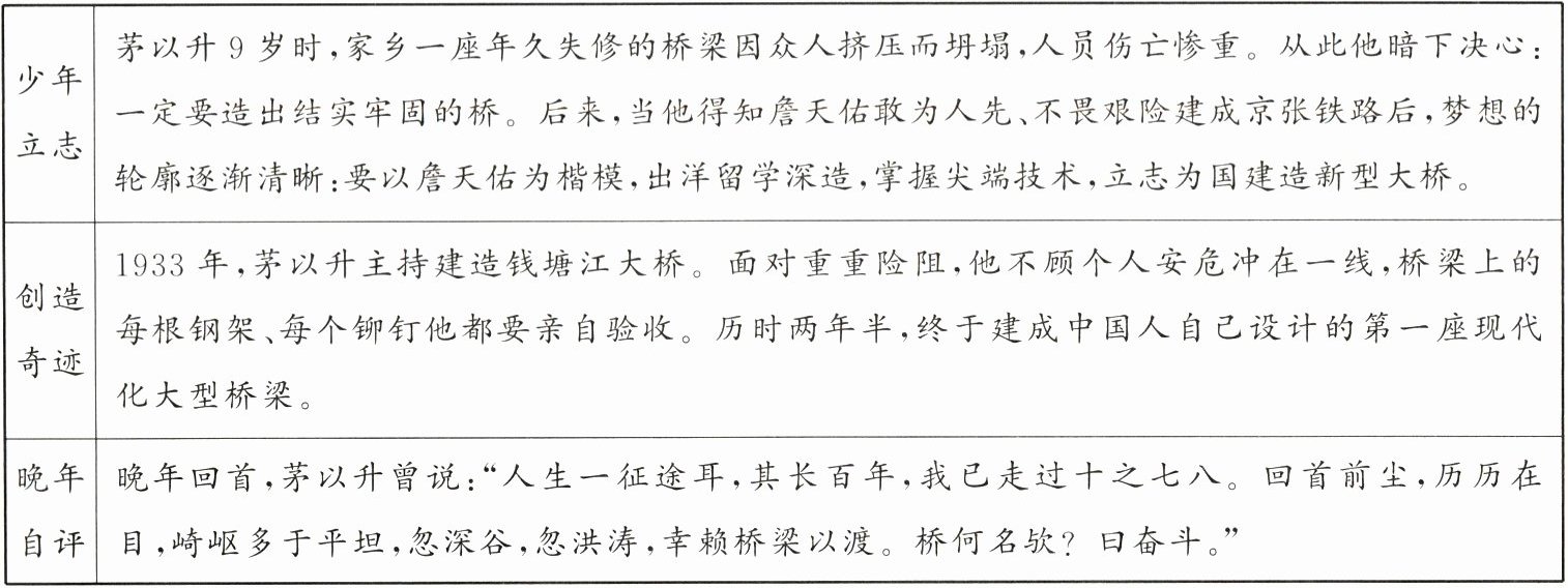 (1)①树立正确的人生目标,应当与国家、民族和人民的利益相结合。我们要把个人的发展牢牢植根于国家、民族和人民的需要,植根于中华民族伟大复兴的事业;②茅以升主持建造钱塘江大桥,桥梁上的每根钢架、每个铆钉他都要亲自验收,启示我们人生价值是通过劳动创造的;③面对重重险阻,茅以升不顾个人安危冲在一线,把自己的小我融入时代,融入祖国和人民的大我之中,在奉献中成就精彩人生。