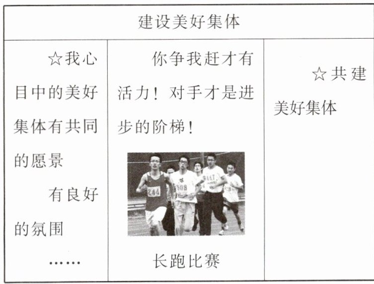 (3)①建设美好集体,要确定共同的愿景。②建设美好集体,要树立主人翁意识。③建设美好集体,要营造和谐有序的集体环境。④建设美好集体,要树立正确的合作与竞争观念。⑤建设美好集体,要坚持集体主义原则,发扬集体主义精神。