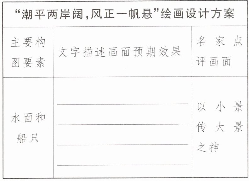 7. (☆课后习题二变式)小语想为《次北固山下》配一幅图画,请你仔细品味,结合颔联诗句,帮她完成下面的绘画设计方案。