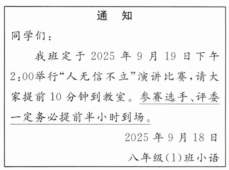 (1)将落款处日期和班级、人名调换位置 将"一定"去掉或者将"务必"去掉