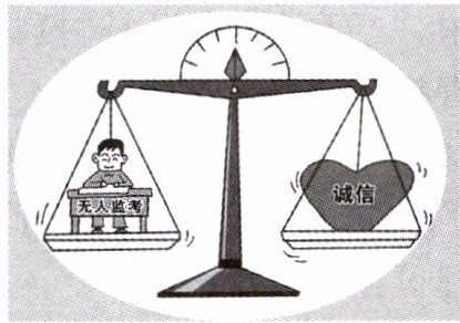 6.画面正中是一个天平,天平的左边是一个小男孩在无人监考的教室考试,右边是一个写有"诚信"二字的红色爱心。 学生参加无人监考的考试,要讲诚信。