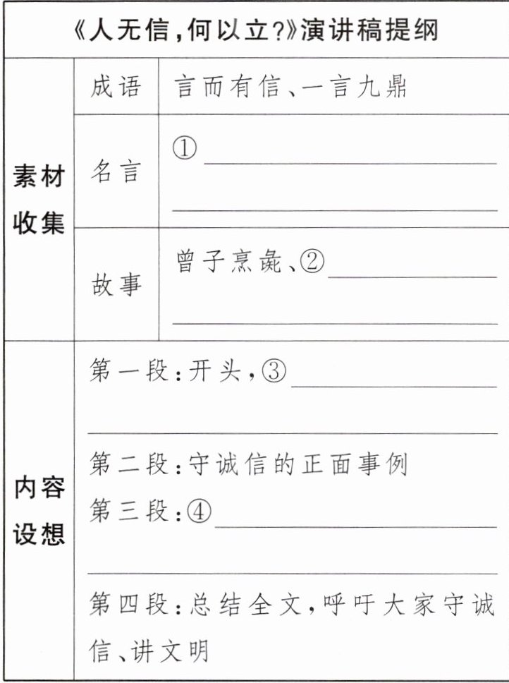 (2)①【示例】诚信为人之本。——鲁迅 ②【示例】季布一诺 ③【示例】引出观点 ④【示例】不守诚信的反面事例