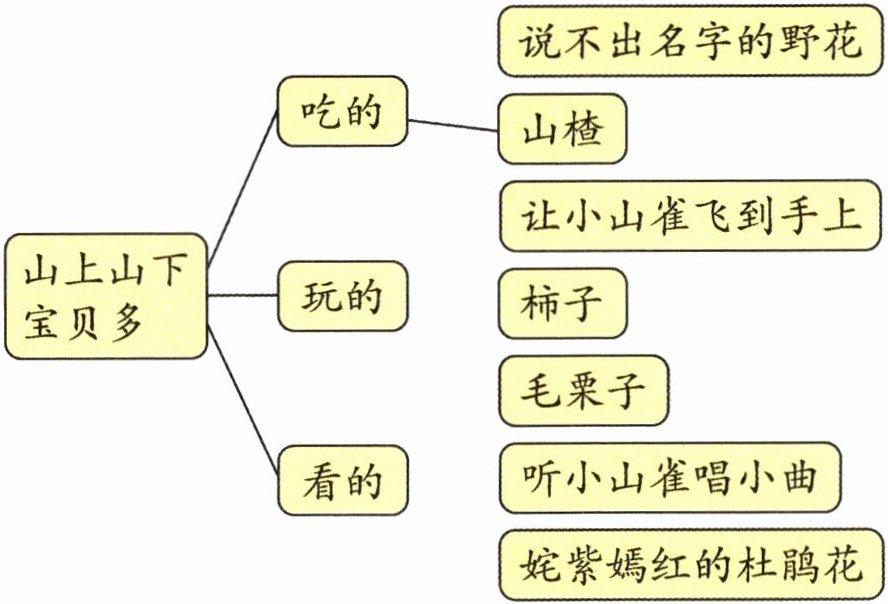 1. 山上山下宝贝多—吃的—山楂、柿子、毛栗子;山上山下宝贝多—玩的—让小山雀飞到手上、听小山雀唱小曲;山上山下宝贝多—看的—说不出名字的野花、姹紫嫣红的杜鹃花