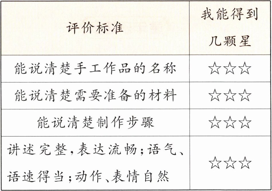 【解析】:本题是语文二年级上册第三单元综合练习中的一道题目,主要考查学生的口语表达和手工制作介绍能力。题目要求把自己做的一件手工作品介绍给大家,并说清楚制作方法,同时给出了评价标准,包括能说清楚手工作品的名称、能说清楚需要准备的材料、能说清楚制作步骤以及讲述完整、表达流畅、语气语速得当、动作表情自然等方面。解答时,学生需要按照评价标准,有条理地介绍自己的手工作品。