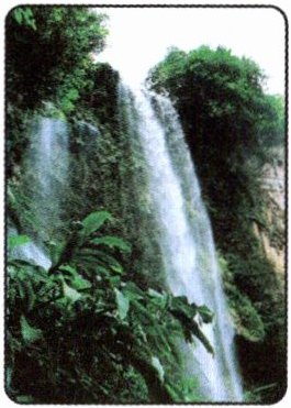 2. 远远看去,瀑布像一条白色的丝带从山间垂落。