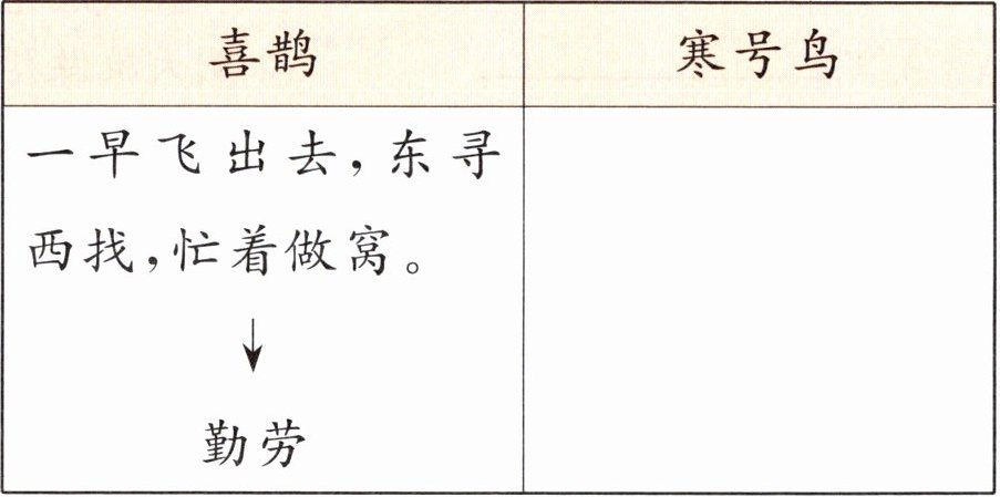 1. 冬天快要到了,喜鹊和寒号鸟为冬天的到来所做的准备是不同的。我能根据课文把表格内容补充完整。