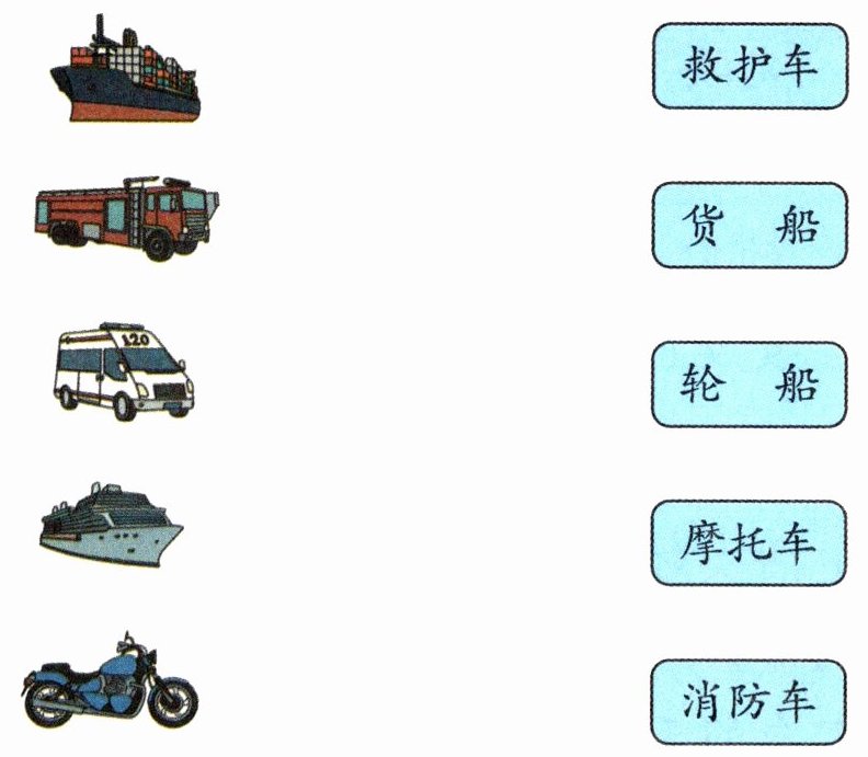 (从左到右,上到下图片依次对应)货船;消防车;救护车;轮船;摩托车