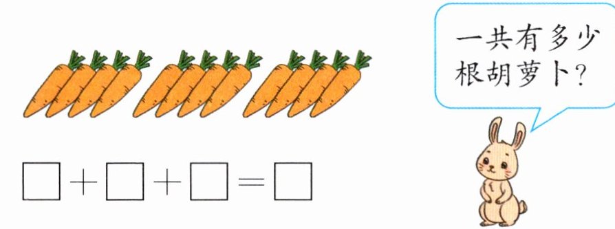 求胡萝卜的总数,就是求$3$个$4$相加的和是多少,用加法计算: