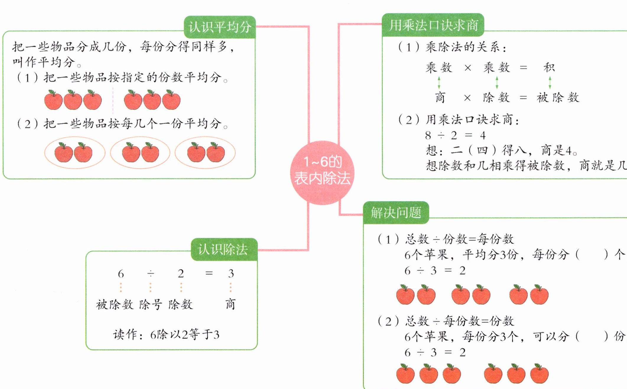 (2)计算$6$个苹果,每份分$3$个,可以分的份数