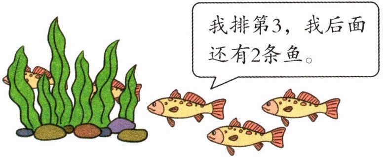 解析:本题考查加法的实际应用,通过鱼的排序信息来确定鱼的总数。已知其中一条鱼排第3,它后面还有2条鱼,要求鱼的总数,就是要把排第3的这条鱼以及它后面的2条鱼合起来,用加法计算。