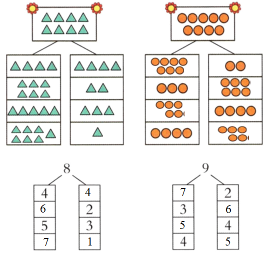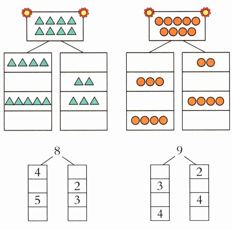 3 把9条金鱼放进2个鱼缸里,可以怎么放?分一分,圈一圈。
