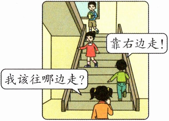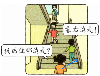 图中女孩上楼梯,以她的视角,另一位小朋友在她的右边,所以她应该靠自己的右边走。