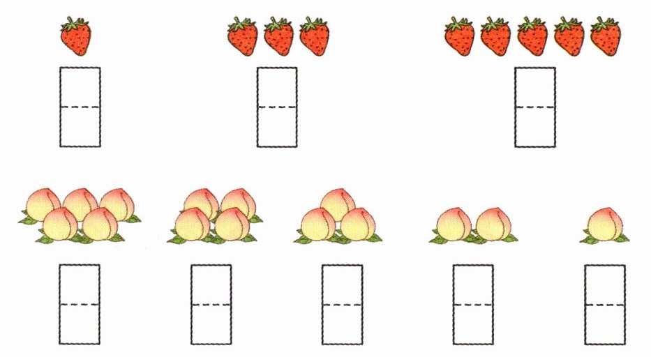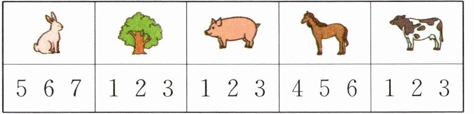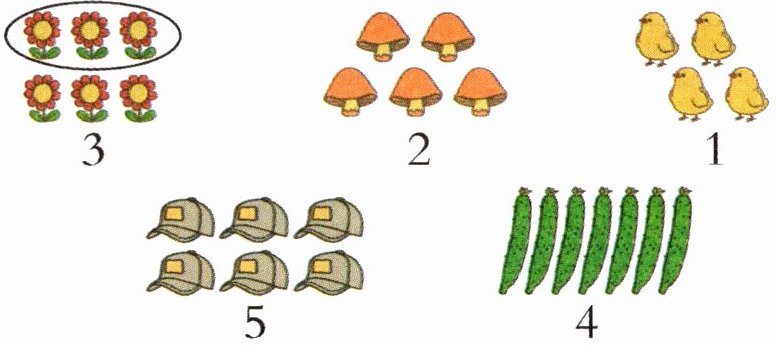 (在蘑菇图中圈出2个蘑菇,在小鸡图中圈出1只小鸡,在帽子图中圈出5顶帽子,在豆角图中圈出4根豆角)