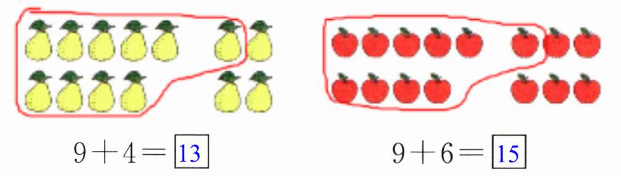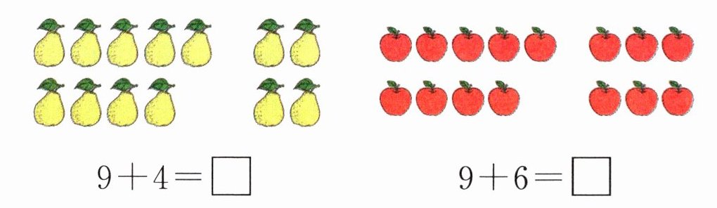 $\begin{cases}10 + 5 = □ \\9 + 1 + 5 = □ \\9 + 6 = □\end{cases} □ $