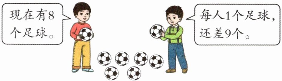 解析:本题考查加法的实际应用。通过图片可知现在有$8$个足球,每人$1$个足球还差$9$个才够,求总人数,需要用现有的足球数量加上还差的足球数量。