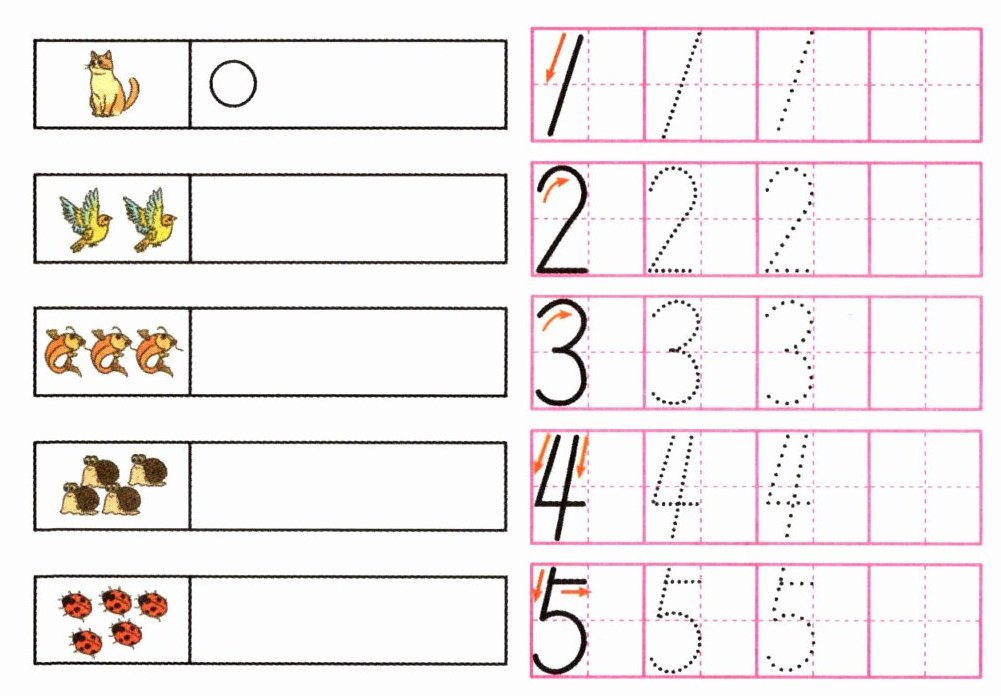 解析:本题考查1-5数字的书写以及数量对应关系。根据左边物品的数量,在右边写出相应数量的数字,并在日字格中规范书写该数字。