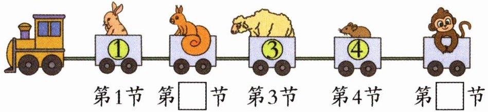 解析:本题考查对数的顺序的理解,通过观察图片中火车车厢上动物对应的数字,按照自然数的顺序来填空。