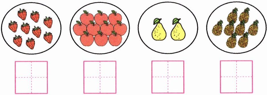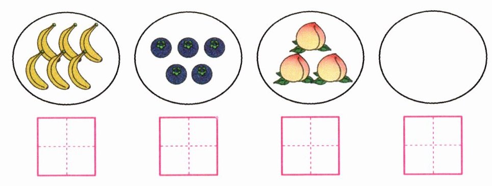 解析:本题考查对100以内数的观察和书写能力。通过观察图片中不同水果的数量,将其对应的数字写在方格中。草莓有8个,苹果有13个,梨有2个,菠萝有7个。