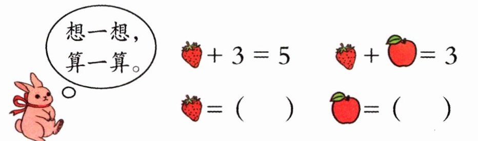 解析:第一个算式中已知一个加数是3,和是5,求另一个加数,用和减去一个加数,即$5 - 3 = 2$,所以草莓代表2。