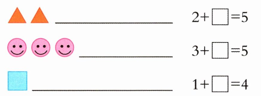 解析:本题主要考查加法运算以及通过图形理解加法算式。对于“$\triangle \triangle$ ______ $2 + □ = 5$”,已有$2$个三角形,和是$5$,那么还需要$5 - 2 = 3$个三角形,所以横线处画$\triangle \triangle \triangle$,$□$里填$3$;对于“$☺☺☺$ ______ $3 + □ = 5$”,已有$3$个笑脸,和是$5$,那么还需要$5 - 3 = 2$个笑脸,所以横线处画$☺☺$,$□$里填$2$;对于“$□$ ______ $1 + □ = 4$”,已有$1$个正方形,和是$4$,那么还需要$4 - 1 = 3$个正方形,所以横线处画$□□□$,第二个$□$里填$3$。