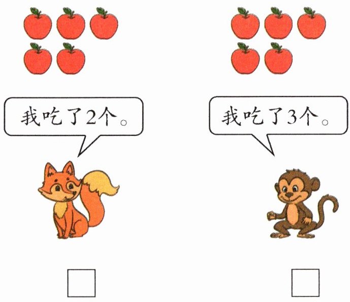 左边狐狸上方苹果原有个数:5个,吃了2个,剩下:5-2=3(个);