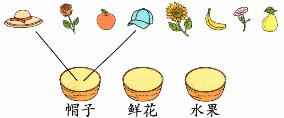 (将图中左侧第一个和第四个物品与“帽子”相连,第二个、第五个和第七个物品与“鲜花”相连,第三个、第六个和第八个物品与“水果”相连)