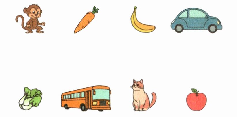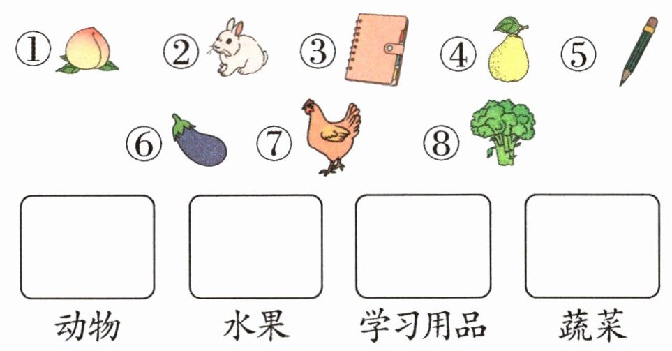 答案:动物:②⑦;水果:①④;学习用品:③⑤;蔬菜:⑥⑧。
