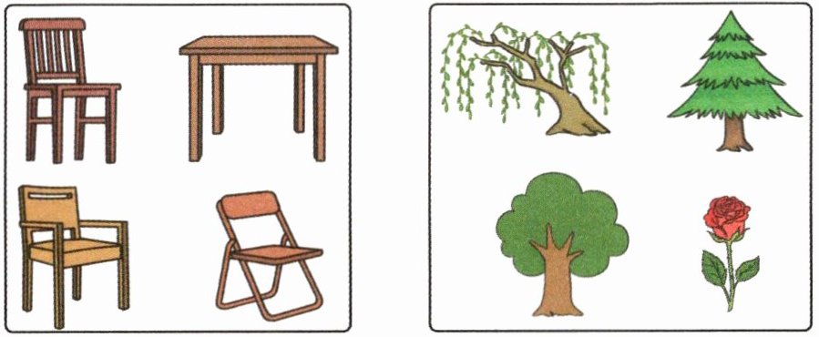 解析:本题第一组图片是椅子或桌子,都属于家具;第二组图片中柳树、松树、树都属于树木,而玫瑰属于花。