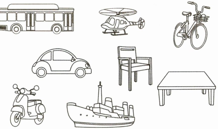 (将图中的公交车、直升机、自行车、汽车、摩托车、轮船涂上颜色)