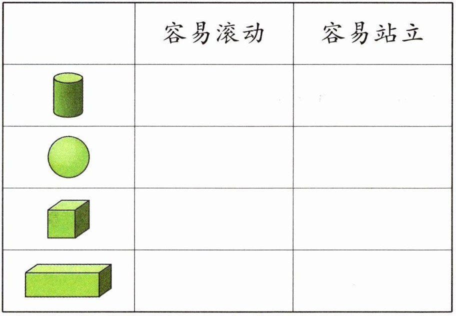圆柱:容易滚动√,容易站立√;球:容易滚动√;正方体:容易站立√;长方体:容易站立√