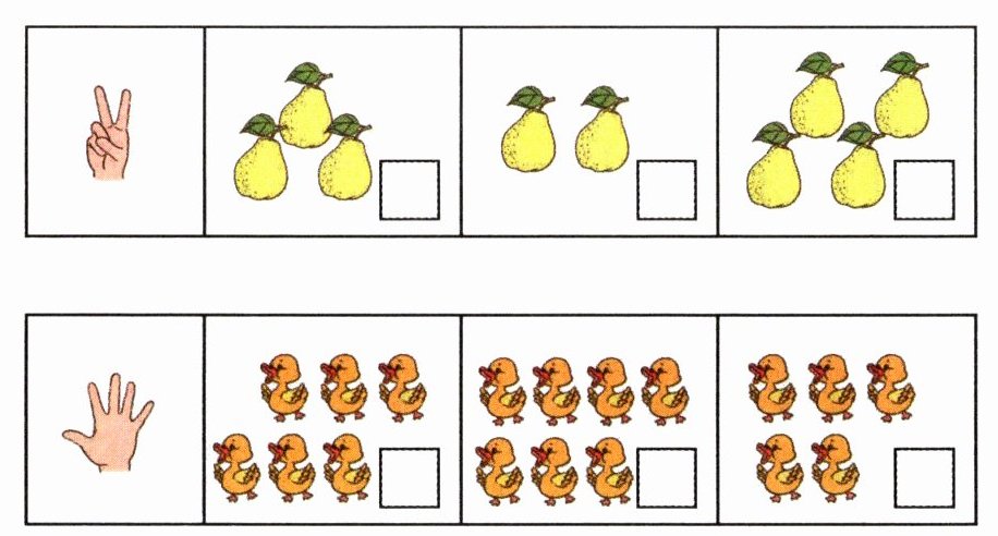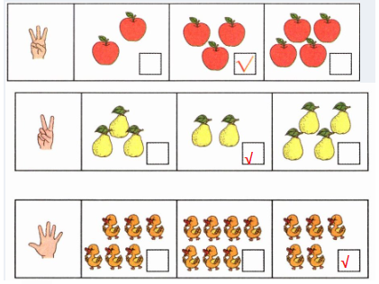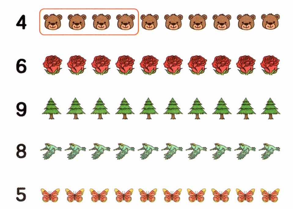 解析:本题考查数数和对应数量的能力。通过观察图片中每种物体的数量,与左侧对应的数字进行匹配。