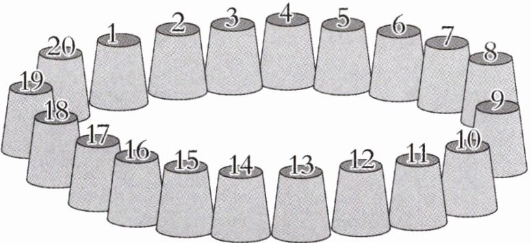 (1)准备20个纸杯和1个乒乓球,把纸杯倒扣在桌面上围成一个圆形,并按顺序在每个纸杯杯底标上序号;