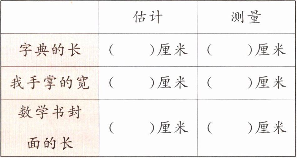 估计步骤需要结合生活经验,对测量对象有一定认知,从而给出估计值;测量步骤需要掌握用尺子测量物体长度的方法,将尺子的0刻度对准物体一端,看物体另一端对准的刻度就是物体长度。
