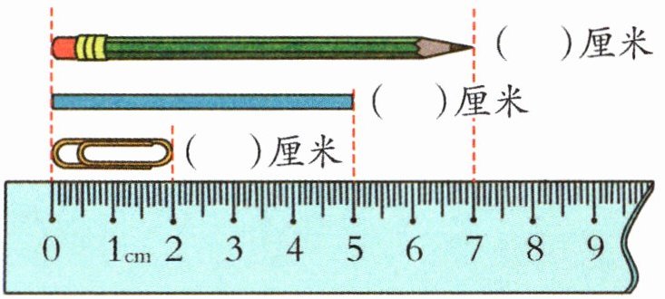 回形针长度:回形针一端在0刻度处,另一端在2刻度处,所以回形针长2厘米。