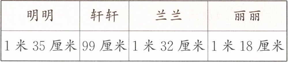 解析:本题主要考查长度单位的换算以及大小的比较,还有减法运算。对于(1),需要先将所有身高统一单位后比较大小;对于(2),用兰兰的身高减去丽丽的身高即可;对于(3),可以提出关于身高差的问题并解答。