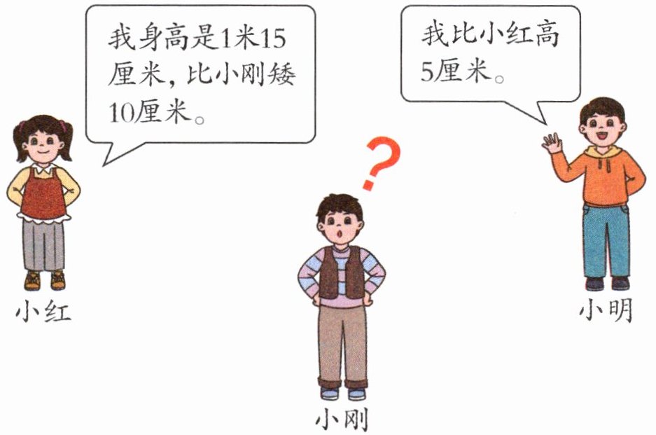 小红:我身高是1米15厘米,比小刚矮10厘米。