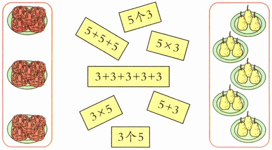 右图(梨)连:5个3、3+3+3+3+3、5×3