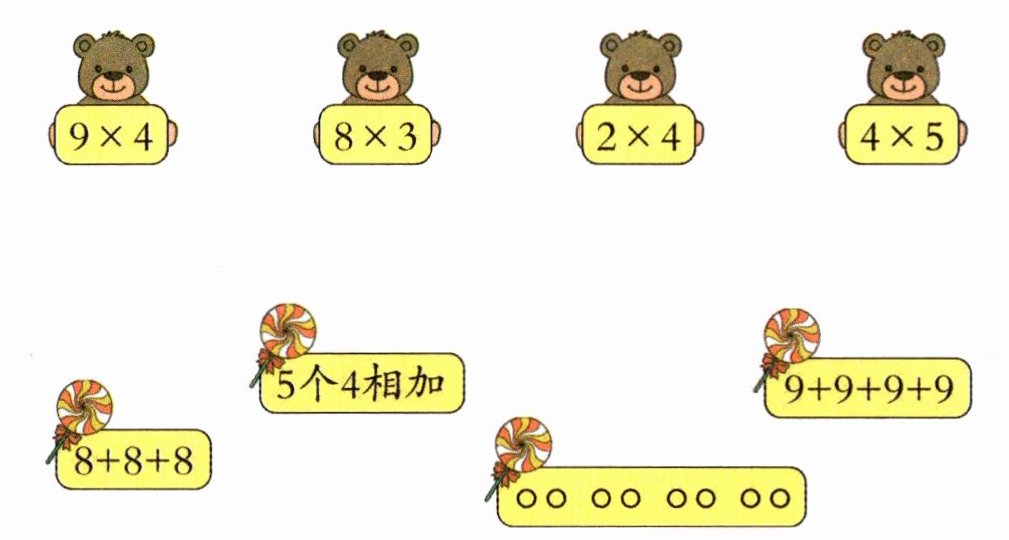 答案:$9×4$连$9 + 9 + 9 + 9$;$8×3$连$8 + 8 + 8$;$2×4$连$○○ ○○ ○○ ○○$;$4×5$连$5$个$4$相加。