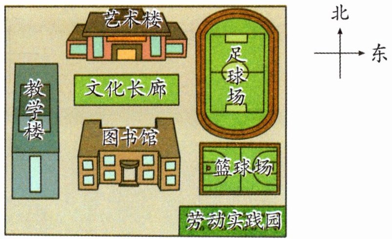 (2)教学楼在篮球场的西面,因为教学楼在篮球场的左边,根据“左西右东”可知是西面;劳动实践园在足球场的南面,因为劳动实践园在足球场的下方,根据“上北下南”可知是南面。