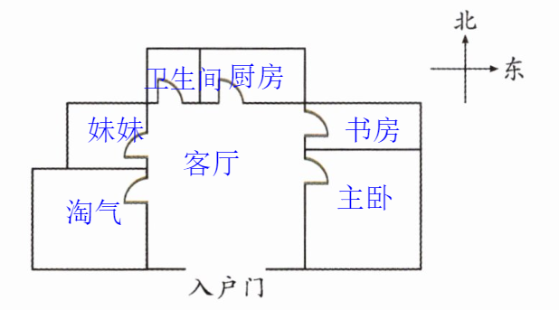 “坐北朝南”是描述房屋朝向的词语,表示房屋背靠北方,门朝南开。淘气家的房子就是坐北朝南,户型如下:中间是客厅,客厅西边分别是淘气和妹妹的房间,淘气的房间在妹妹房间的南边;厨房和卫生间在北边,厨房在卫生间东边;主卧与书房在客厅东边,书房在主卧北边。