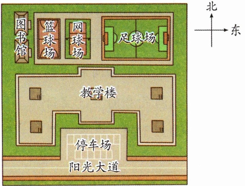 解析:题目考查对于校园建筑的认识和了解,需要根据校园的实际布局,识别出主要建筑和区域。从图中可以看到,校园内标注了多个建筑和区域,包括图书馆、篮球场、网球场、足球场、教学楼、停车场等。题目要求绘制主要建筑和区域的轮廓,根据校园的实际布局和重要性,可以选择图书馆、教学楼和足球场作为主要建筑进行绘制。