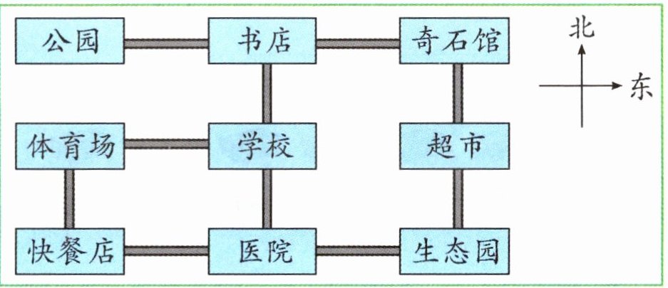 路线一:从公园向东走到书店,再向东走到奇石馆,再向南走到超市,再向南走到生态园。