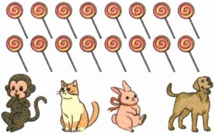 小猫、小兔、小狗到小猴家做客。小猴想把棒棒糖平均分给自己和 3 位好朋友。
