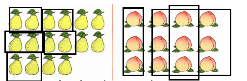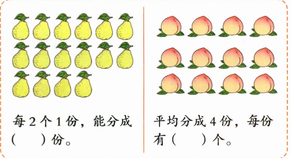 解析:本题考查除法的初步认识,即包含除和平均分的知识点。对于第一组图形,通过圈一圈的方式,将梨每$2$个分为一份,数出份数;对于第二组图形,将桃子平均分成$4$份,数出每份的个数。